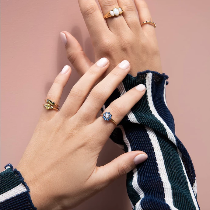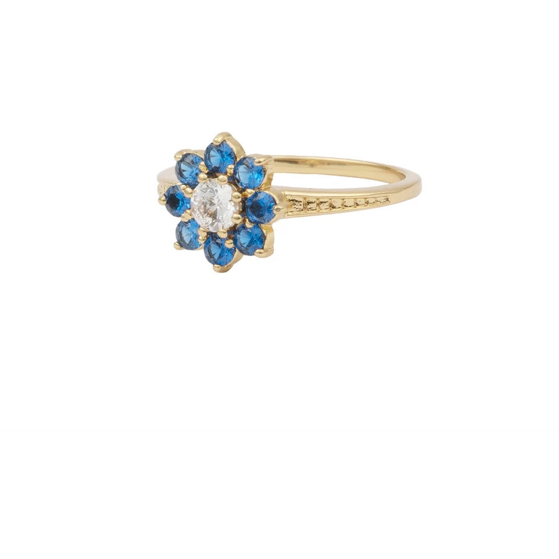 This classic vintage-style ring features a central Zirconia surrounded by blue gems. It’s delicate, cute and sooo sparkly 🌸