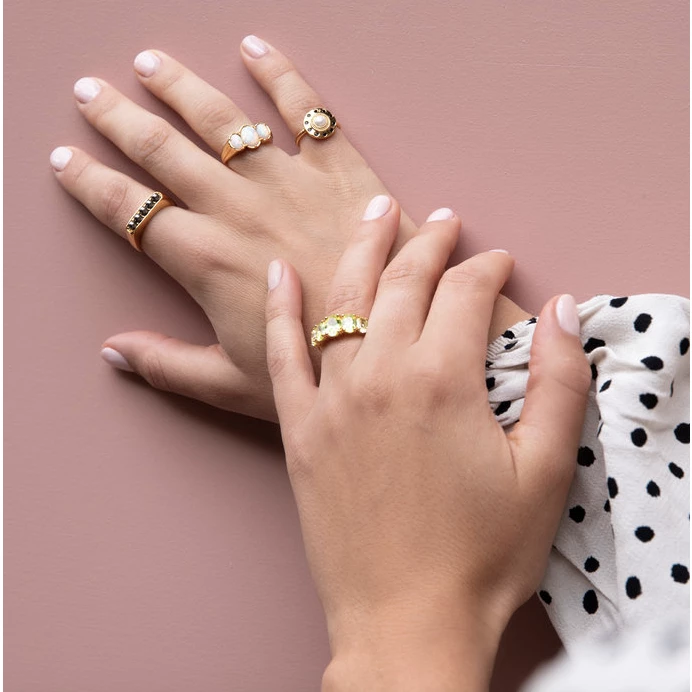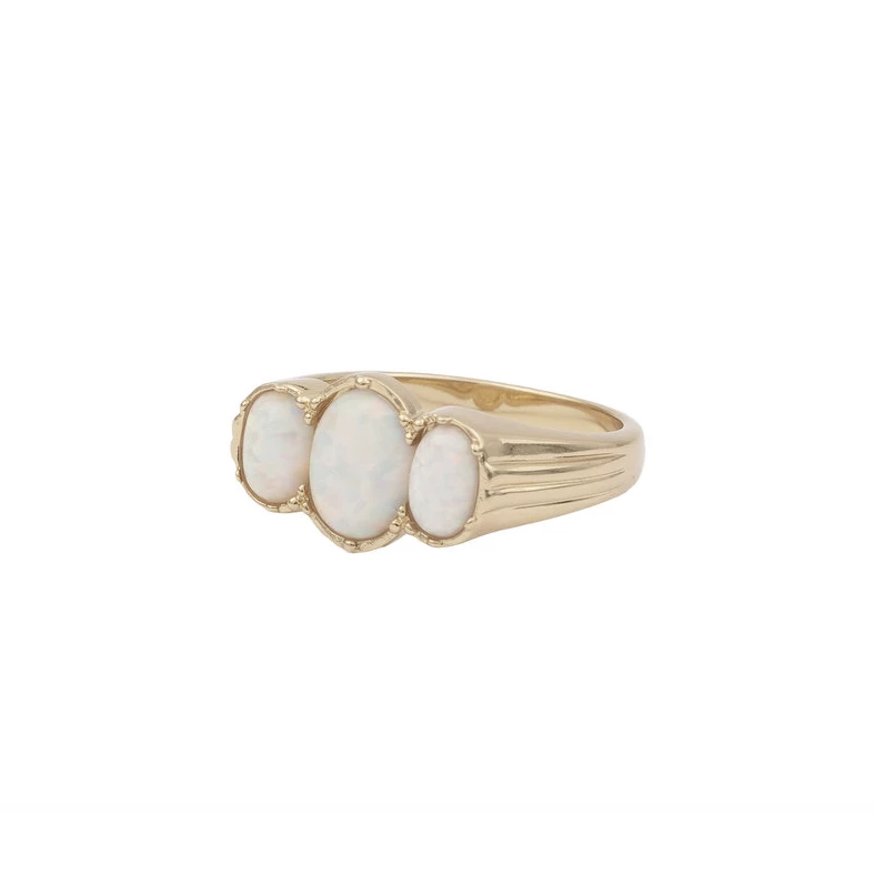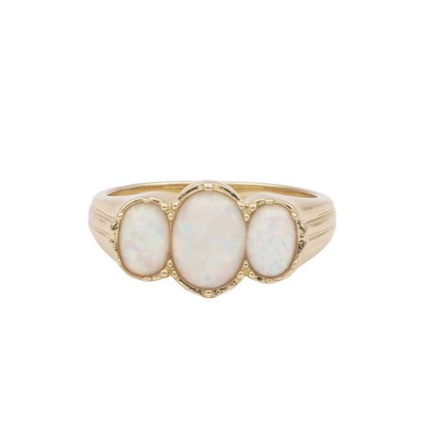 A chunky gold ring inset with three bold synthetic opals. This unusual style adds drama to any look and is especially amazing when the sun shines! 💍