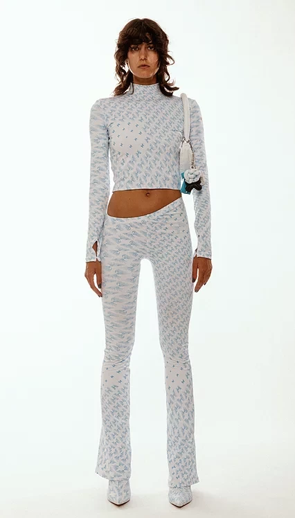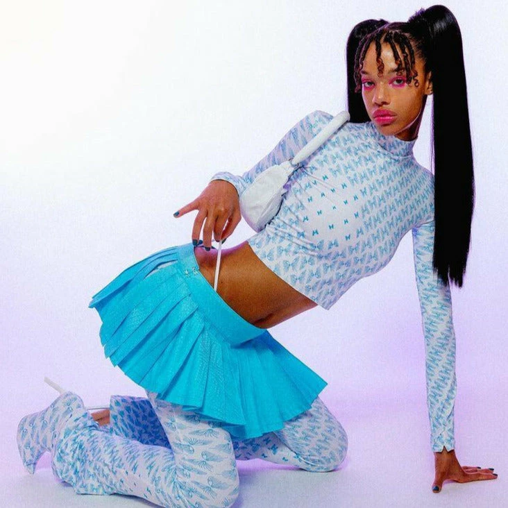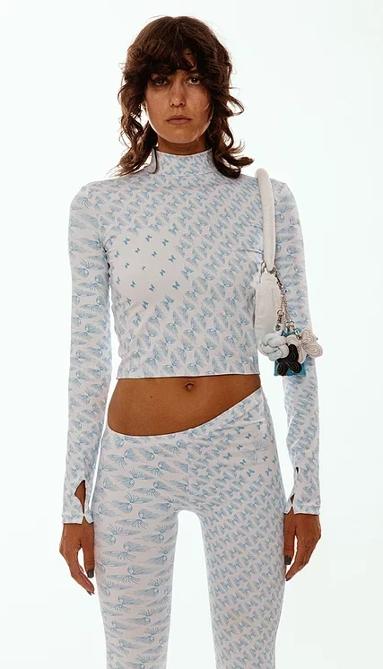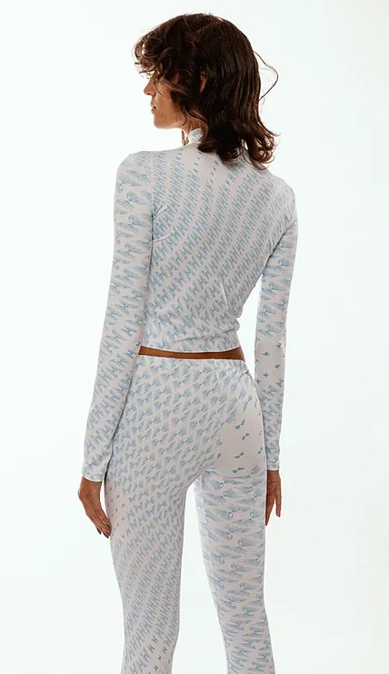 Statement longsleeve cropped lycra top with high neck and thumb holes.