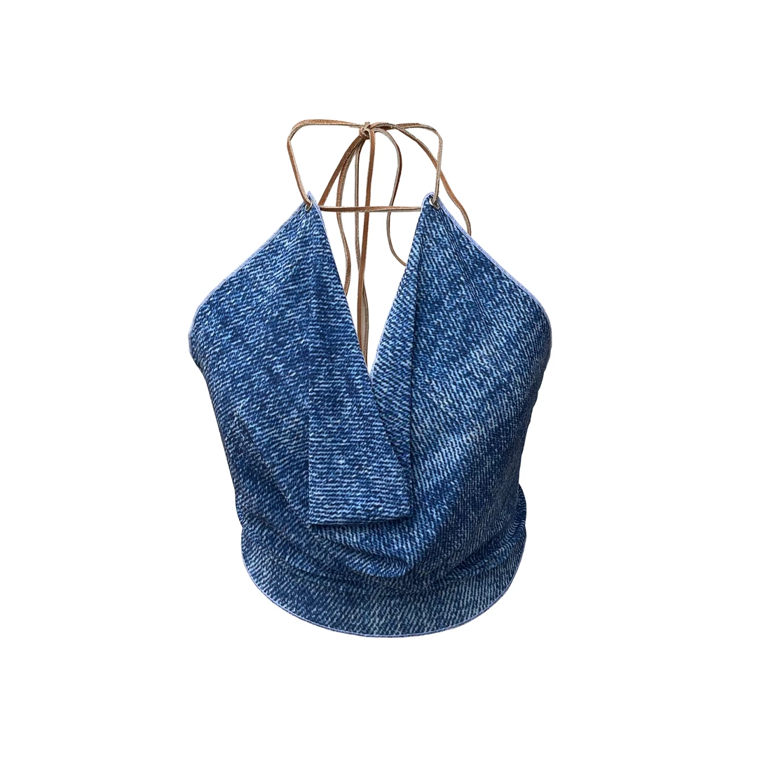 Backless stretch denim-look top featuring suede straps and silver eyelet.
