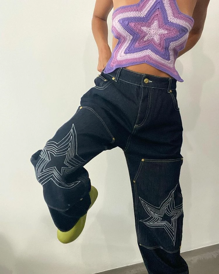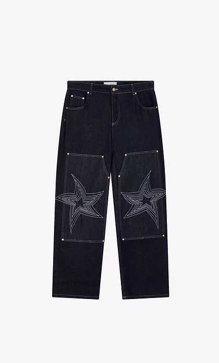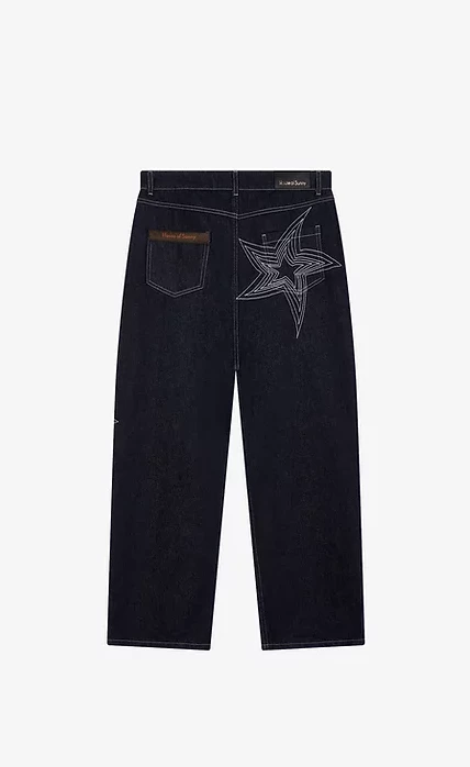 These star-embroidered jeans have a low rise, wide leg and slouchy silhouette found in skate or workwear. Woven from 100% cotton, they’re crafted through an environmentally-friendly washing technique. Aptly titled ‘Only Shooting Stars,’ this denim is characterised by oversized knee patches with embroidered stars, white topstitching and a single star embroidered on the back pocket.