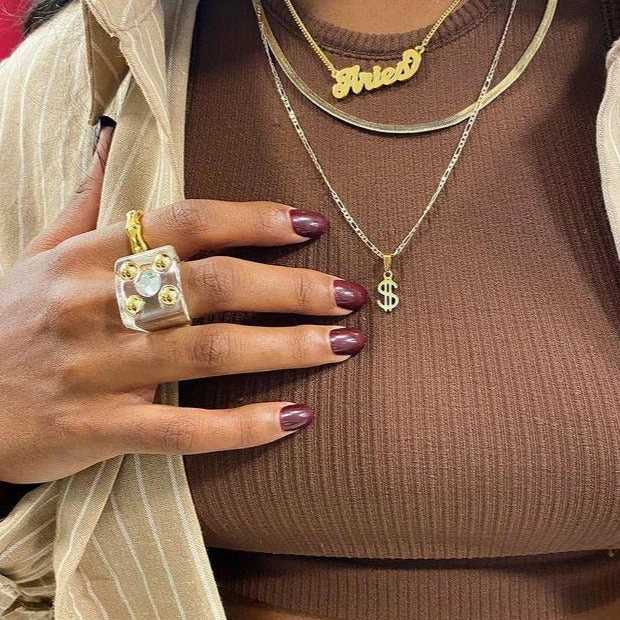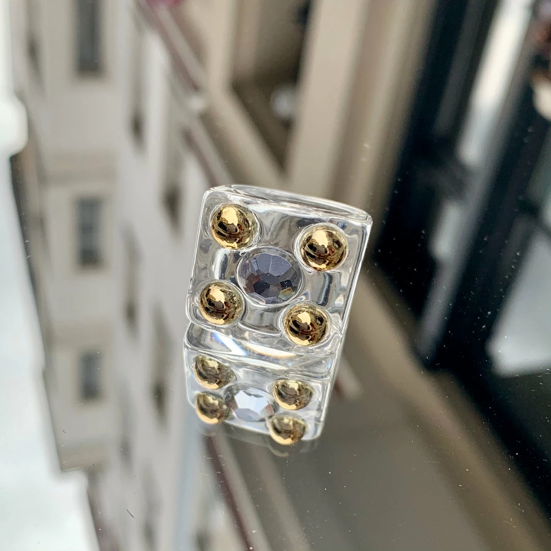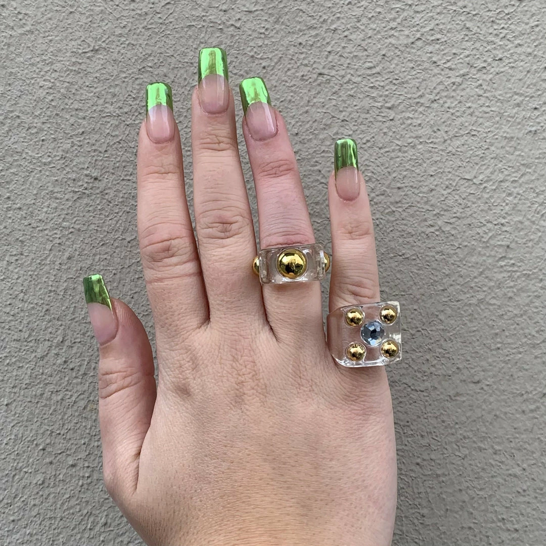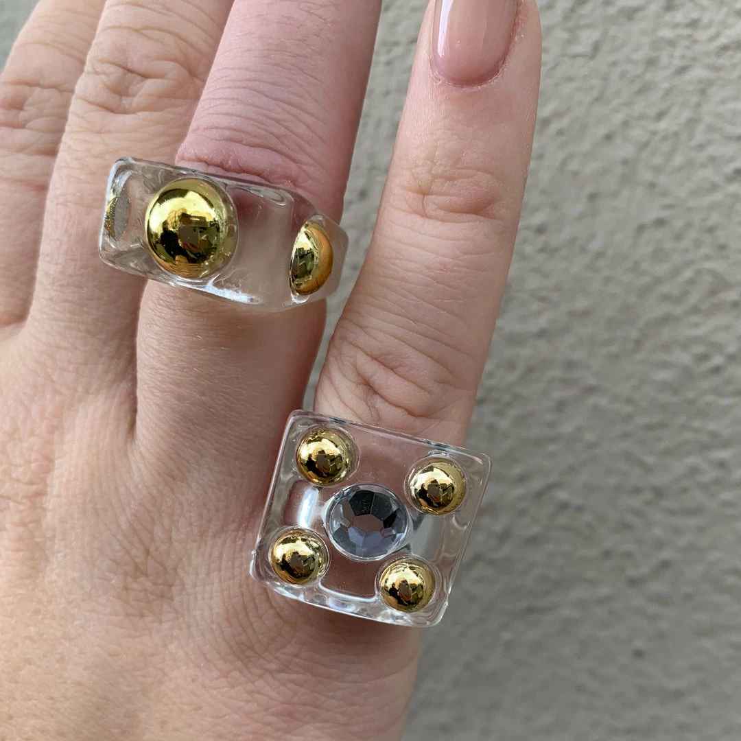 The Kenya ring is a large clear resin ring embellished with a clear gem in the middle and four gold studs surrounding it.