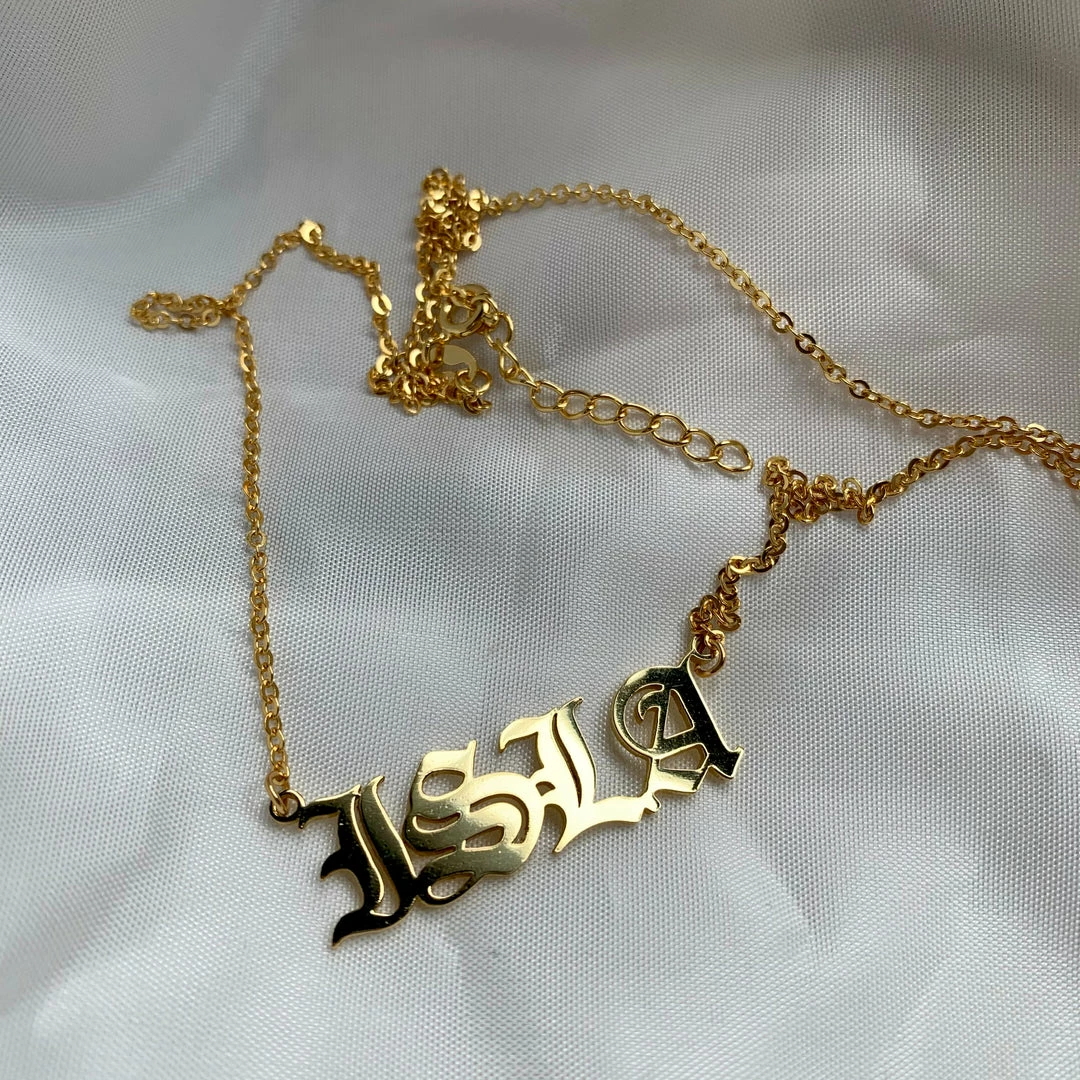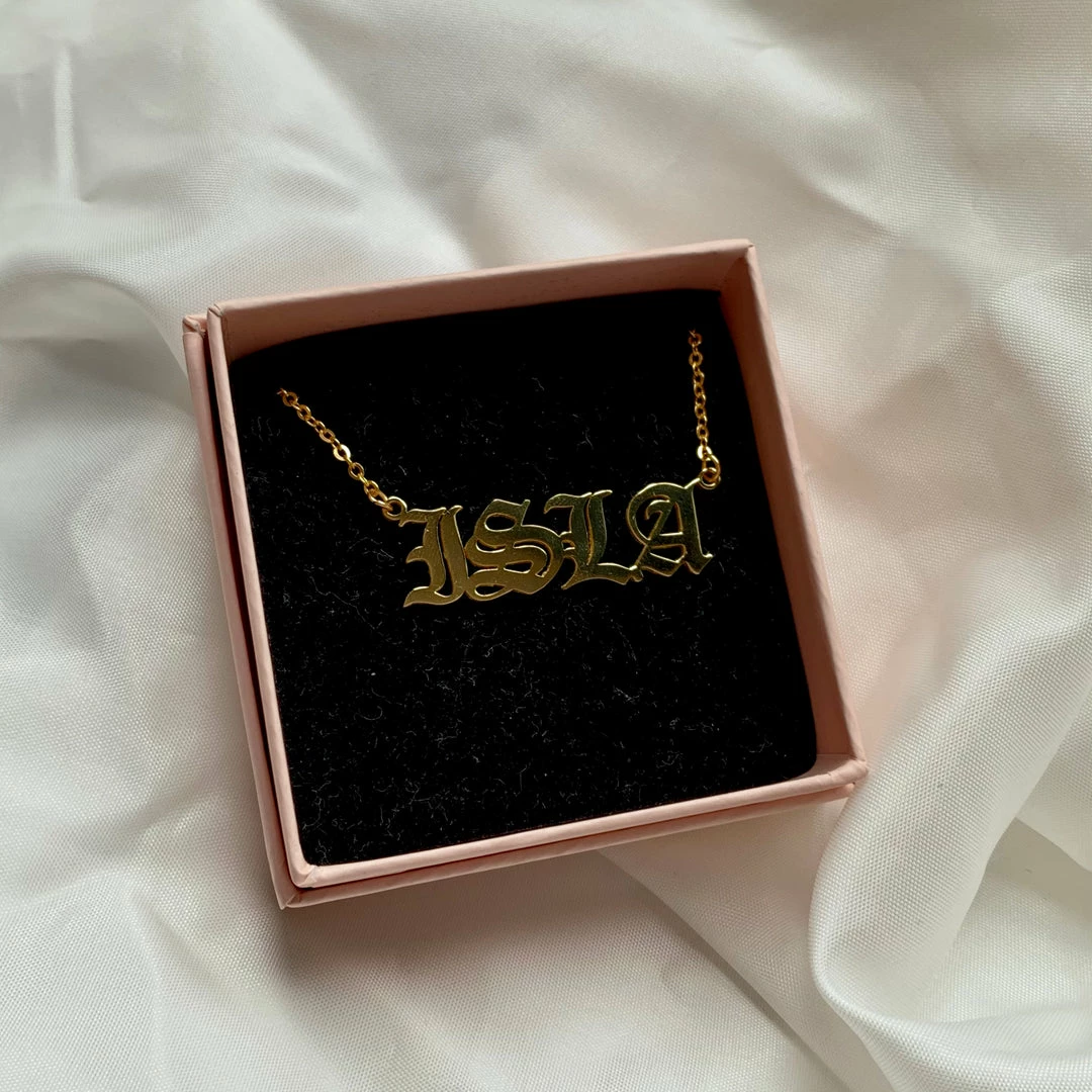 Sterling Silver based nameplate gold plated necklace with gothic letters. Chain is 45,7 cm and can be adjusted.