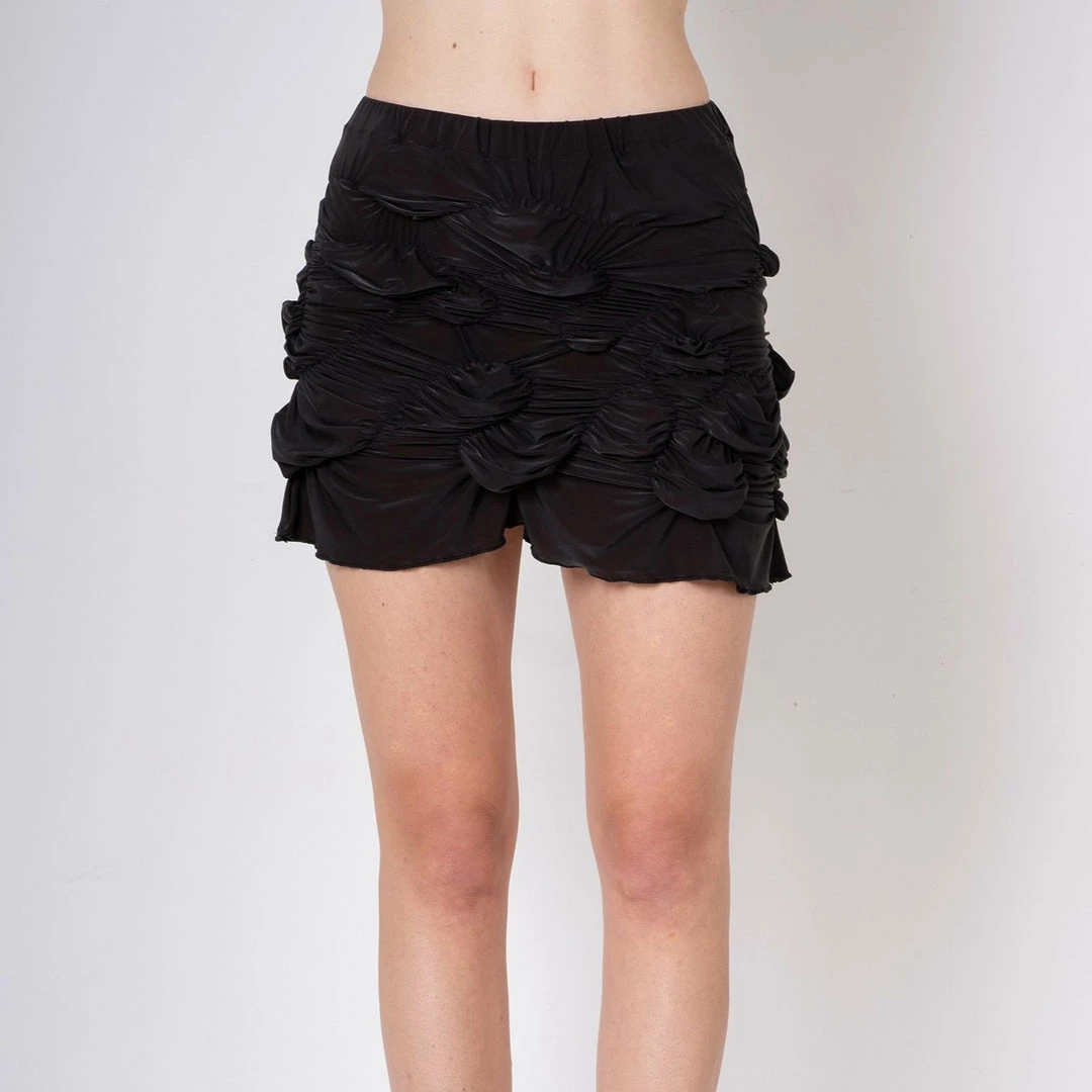 The Chaos Skirt in bronze is an irregular shirred mid-waist skirt with lettuce hem detail, made of sleek stretchy fabric. The shirring technique makes the fit of the garment adaptable to the wearer.