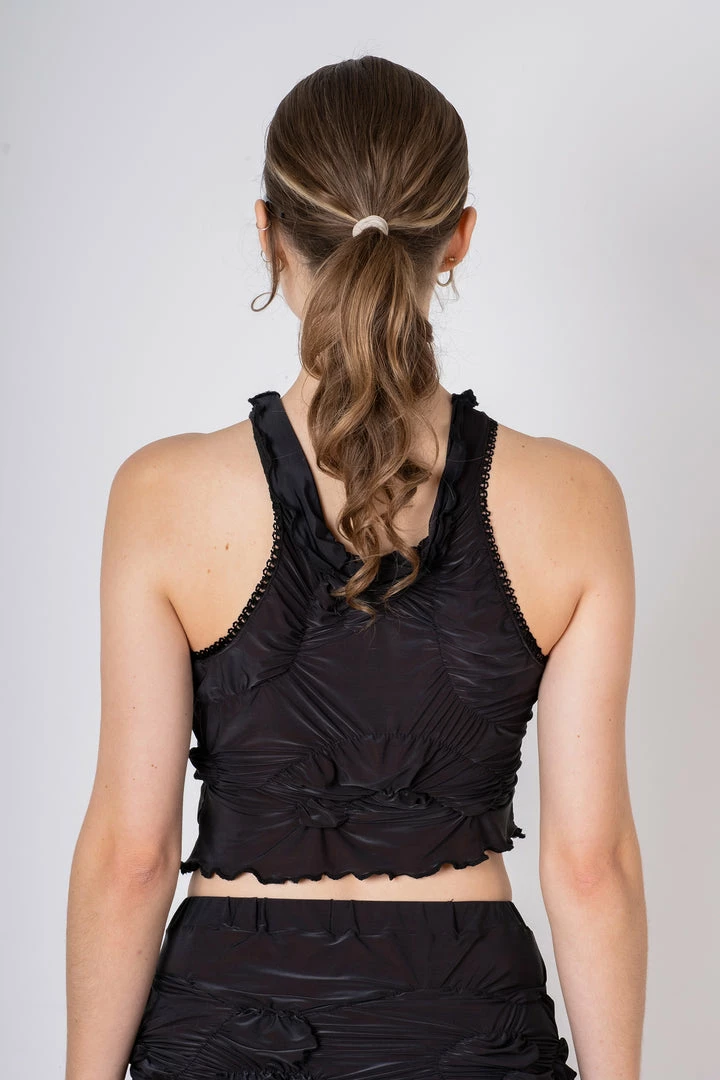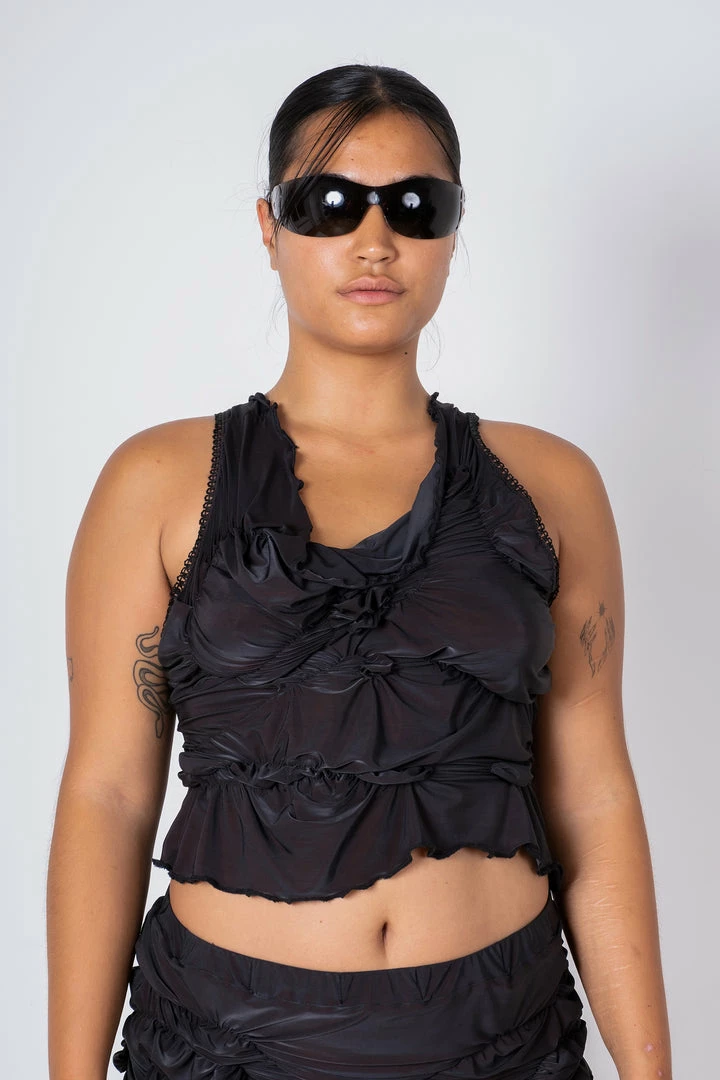 The Chaos Top in bronze is an irregular shirred tank top with lace trimming and lettuce hem detail, made of sleek stretchy fabric. The shirring technique makes the fit of the garment adaptable to the wearer.