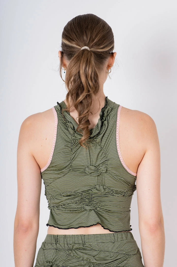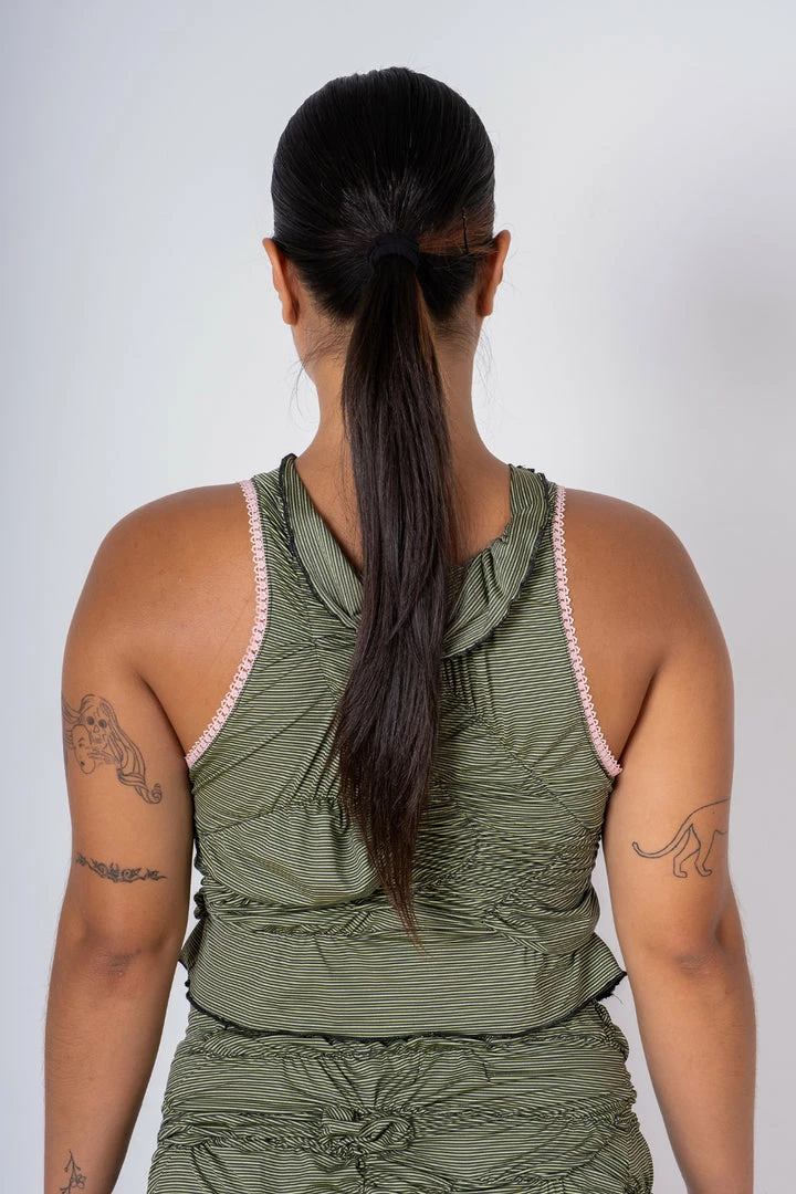 The Chaos Top in green is an irregular shirred tank top with lace trimming and lettuce hem detail, made of sleek stretchy fabric. The shirring technique makes the fit of the garment adaptable to the wearer.