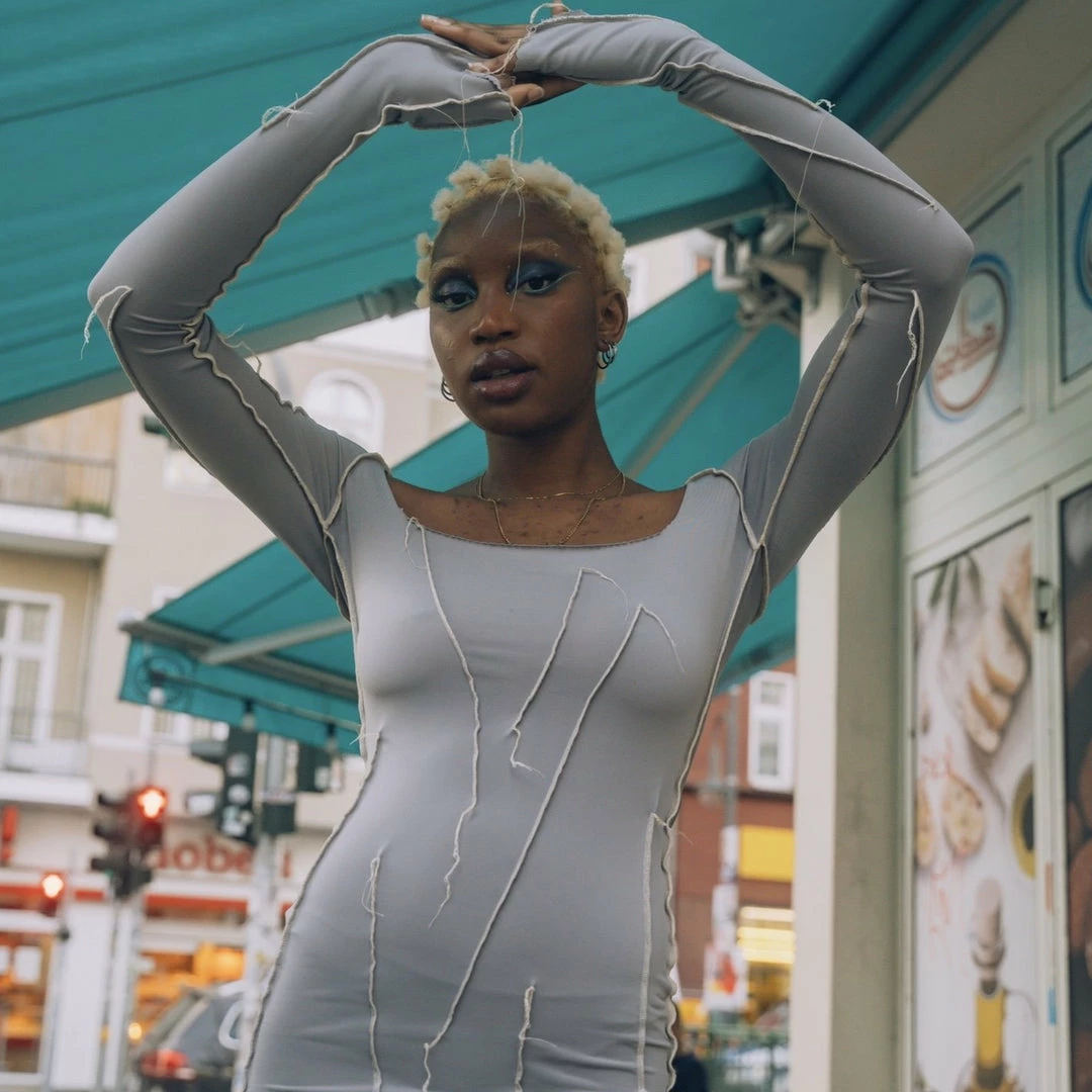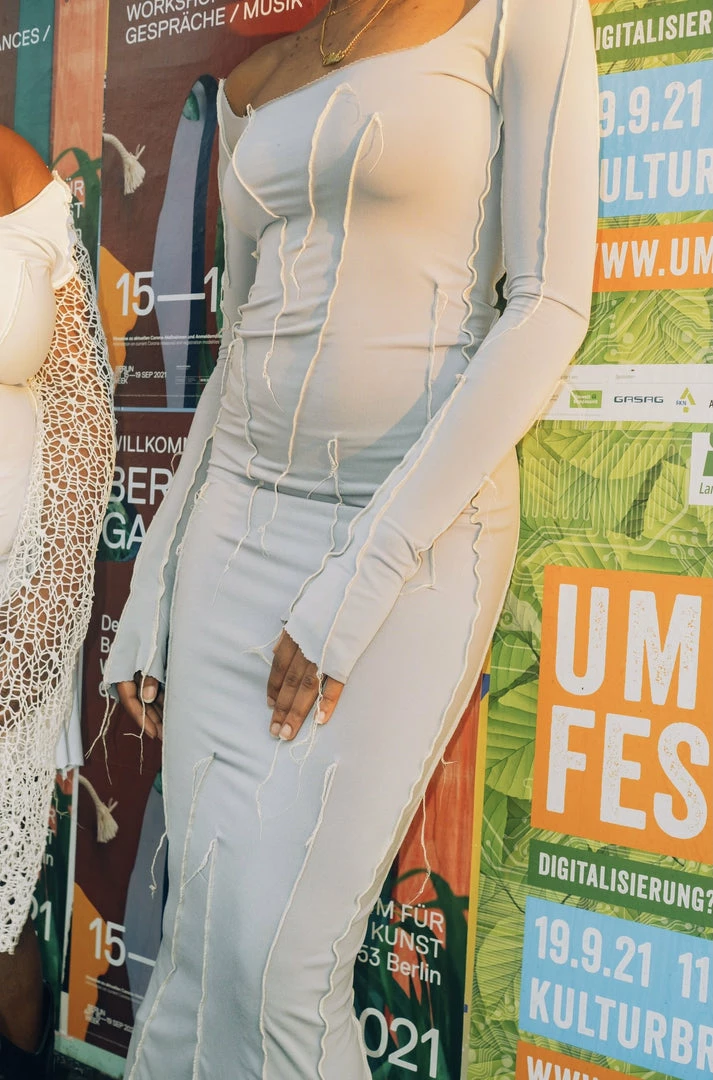 Not your average Maxi dress! 1106Airy takes it to another level with the off white accent stitching, slight bell sleeves, slit on one leg in the cold grey ultra stretching spandex material. Made to adapt to every bodyshape!