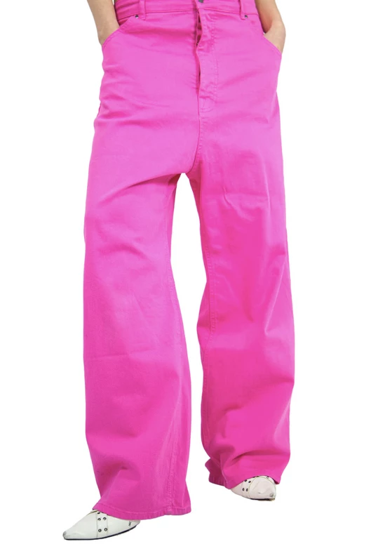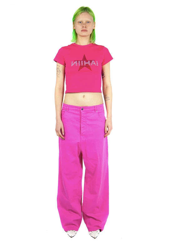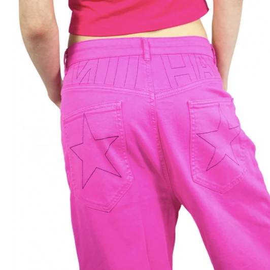 Low waisted extremely baggy pink jeans with contrast stitching. Star stitching on the pockets & Nii HAi on the yoke. Straight leg.