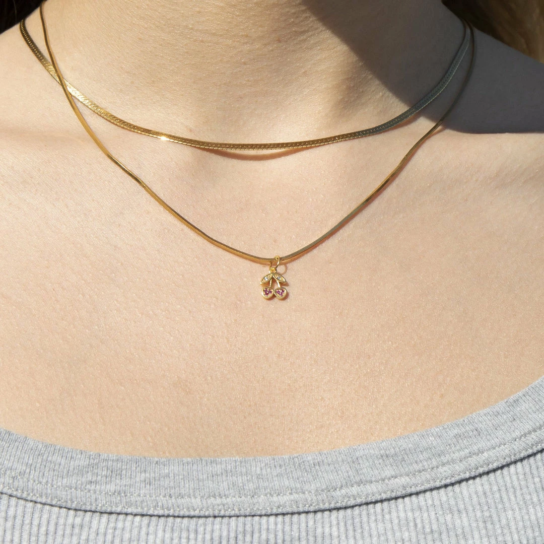 Looking to spice up an old necklace or chain of yours? Here’s the perfect dreamy 18ct yellow gold minimalistic cherry charm with embedded gems.