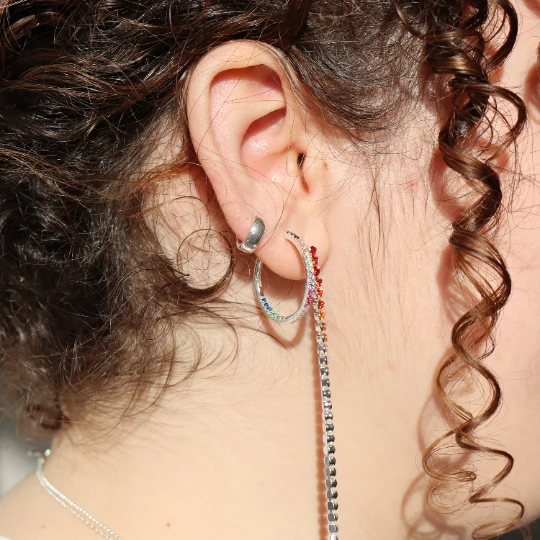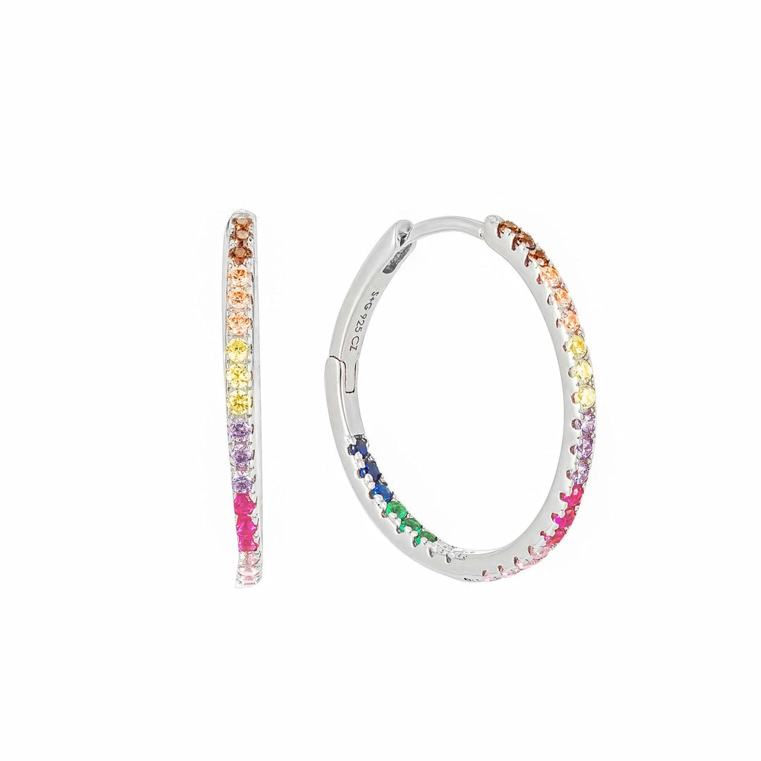 Double-sided sterling silver rainbow cz hoop earrings with cubic zirconia stones. Sold as a pair.