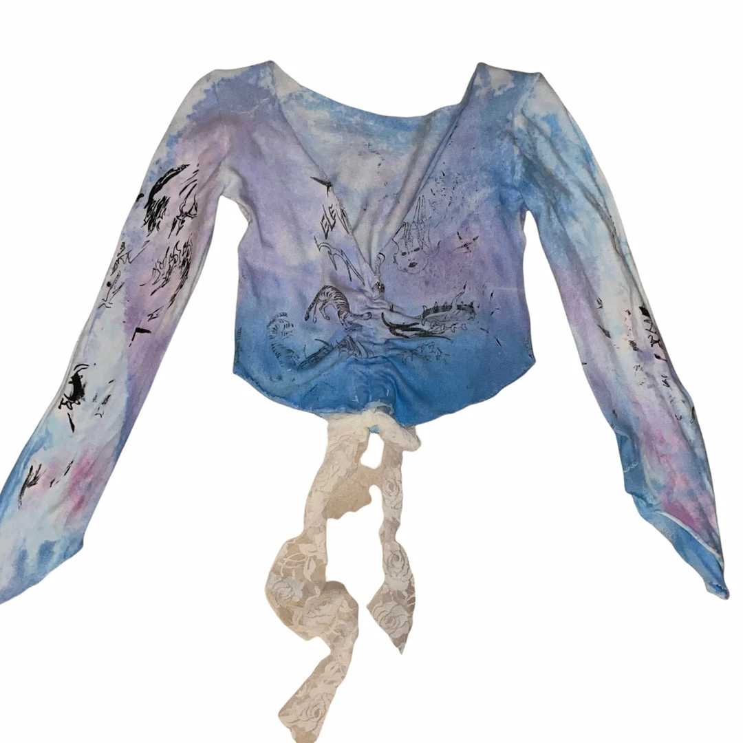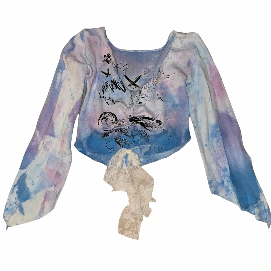 This angelic long sleeve top is constructed of soft cotton baby knit, hand made tie dye with blue tones, and printer with Snake Divine tattoo designs. It features a ruffled front, cream lace ribbon, raw hems, and a signature Snake Divine gold pendant.