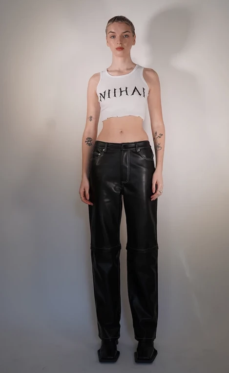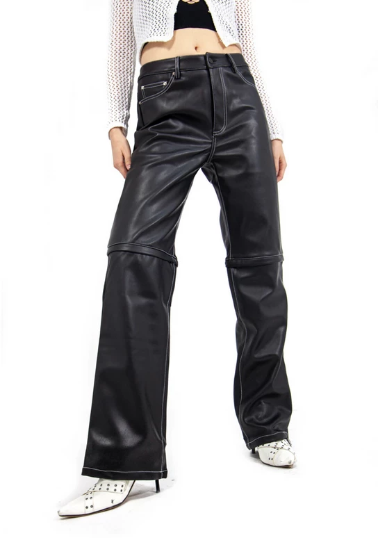 The perfect leather look trousers. Straight leg, mid/low waist leather look trousers with grey contrast stitching & knee zips. The zips allow the trousers to be worn as shorts or with open knees.