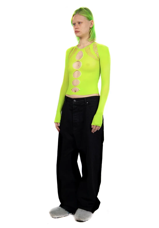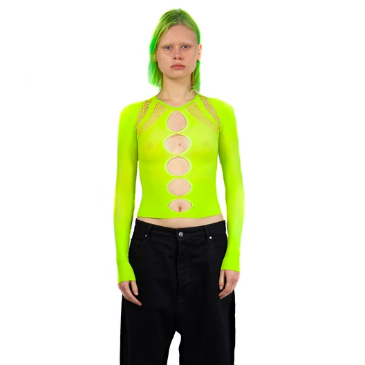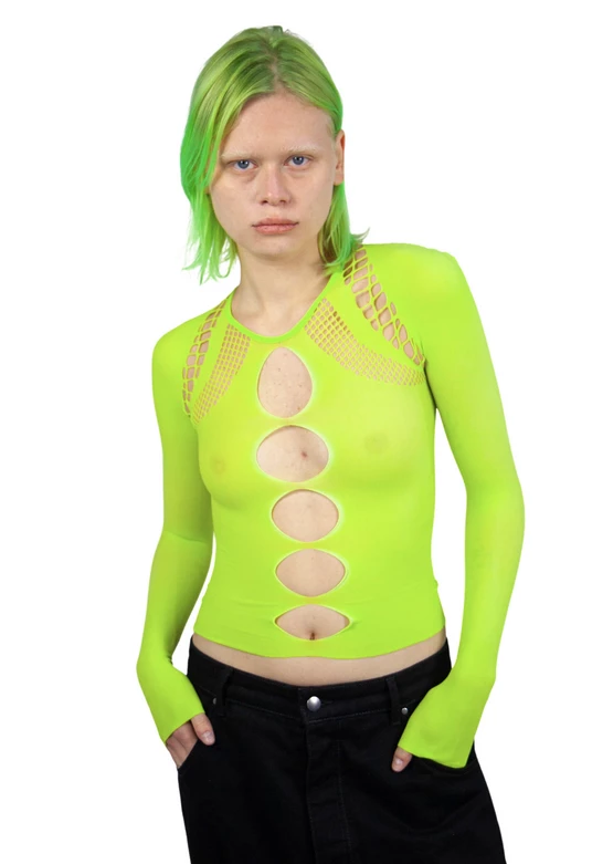 Seamless shapewear top with openings down the front, V-neck and long sleeves.