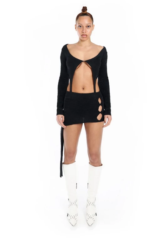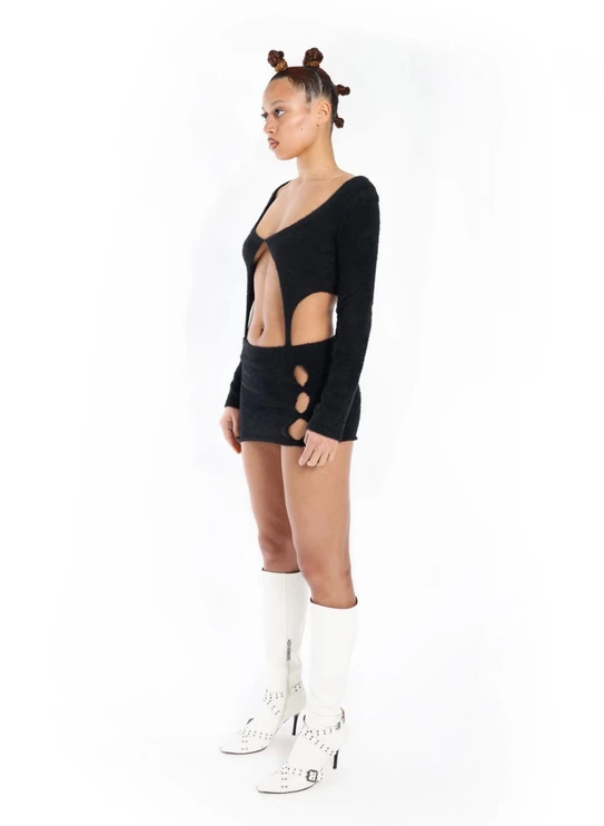 Brushed knit two-piece dress. Can be worn separately or hooked together. Long sleeve top and asymmetrical mini skirt.