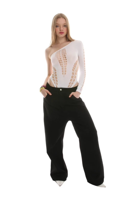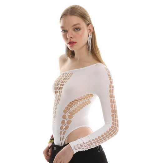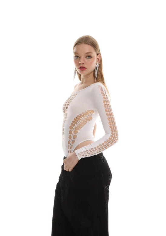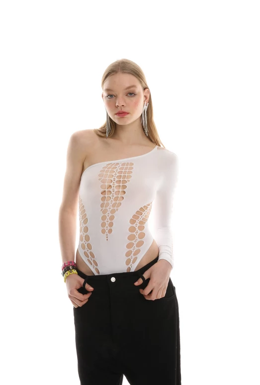 Sexy white one shoulder long-sleeve high-thigh bodysuit with holes down the front, sides and sleeve.
