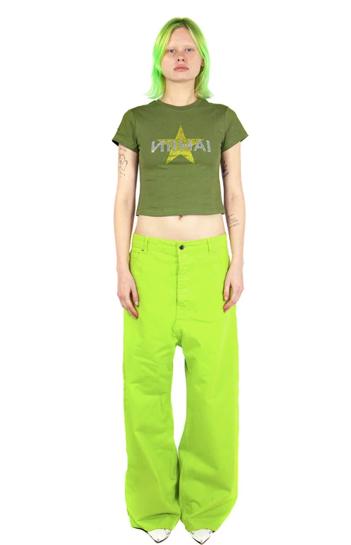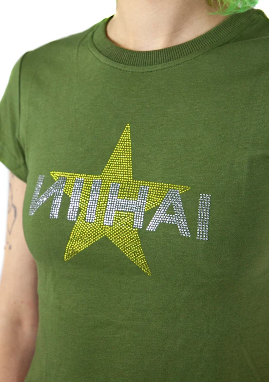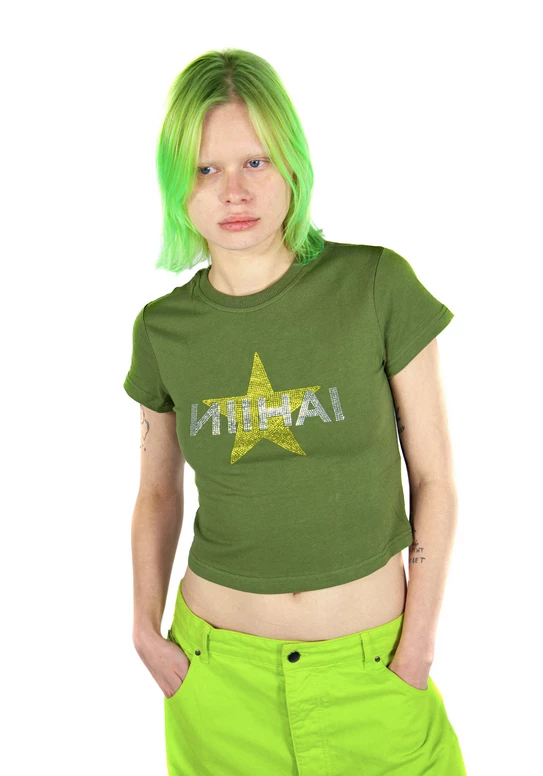 Pink baby tee with rhinestone star and Nii HAi logo in contrasting colours.