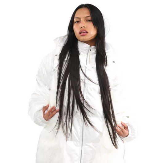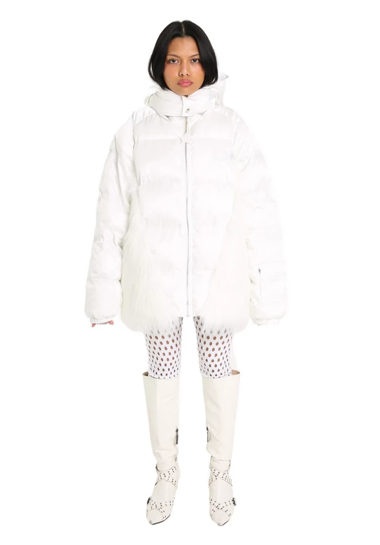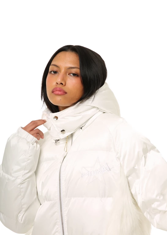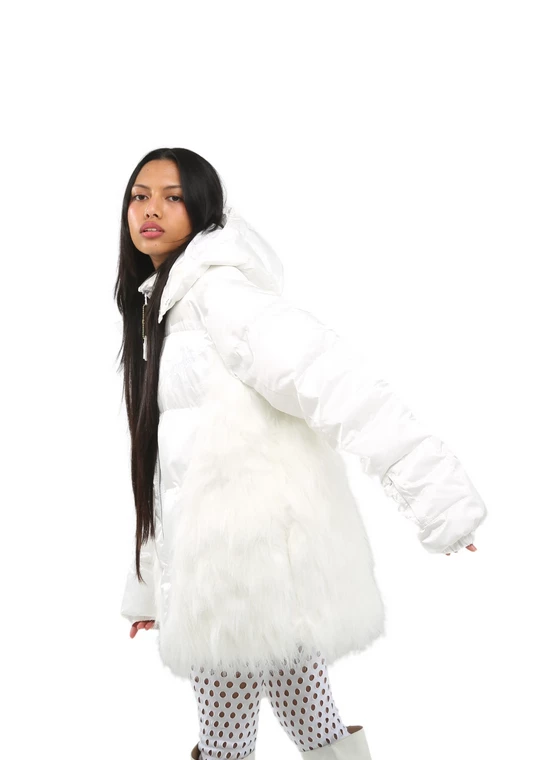 White pearly puffer coat with fur panels. Nii HAi embroidery and sleeve pocket. Custom zip.