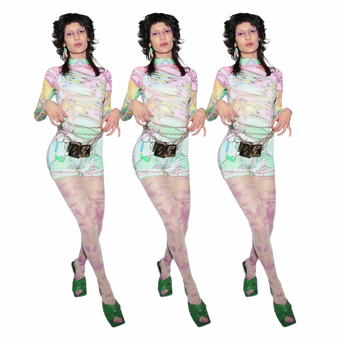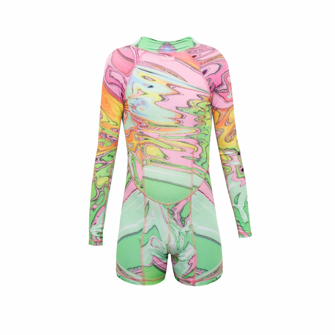 Printed long sleeve short Lycra jumpsuit. Hidden zipper in the back, small turtle neck, pink contrast seams.