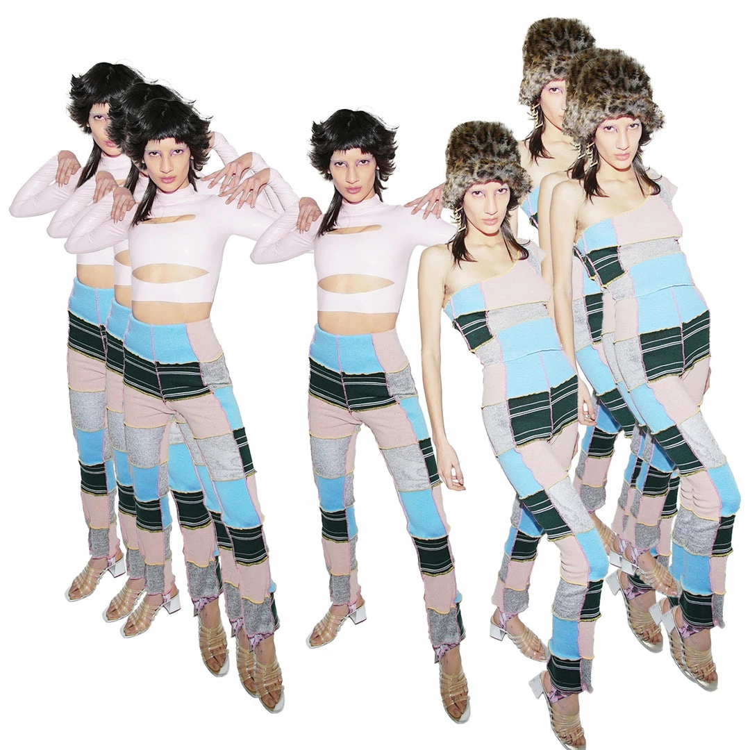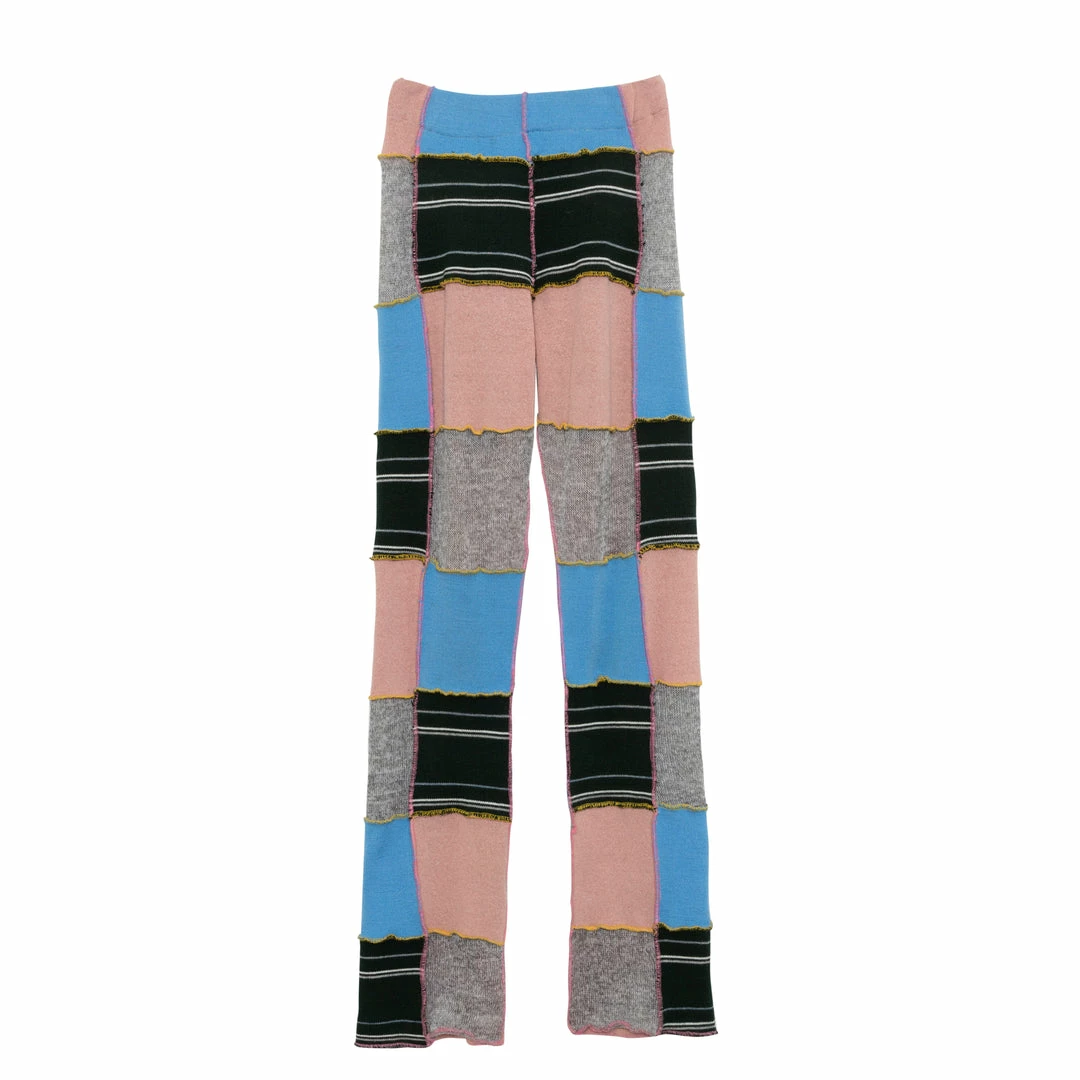 Upcycled straight leg pants. This piece is made with patchwork of different knitted past collections fabric, is stretch and the seams are visible