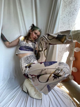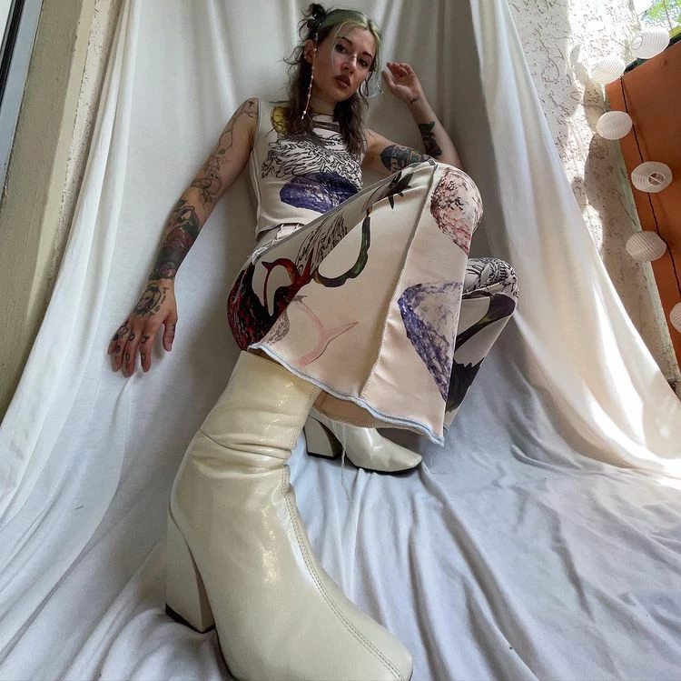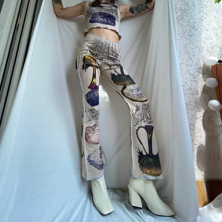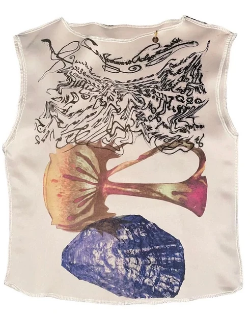 Prints of shells, 60s vases and antique font. Contrast stitching details