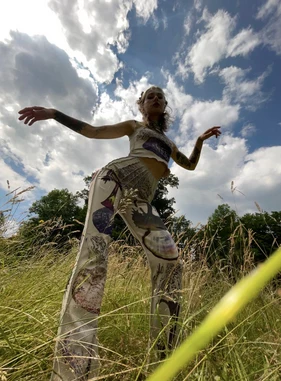 Model is 170cm/5″7 and usually wears S. Pants and top are very stretchy and fit sizes XS to M. Pants waist flat 30-40cm.