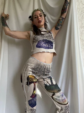 Pants with comfy flared fit with extra length. Golden cross pendant and snake divine pendant
