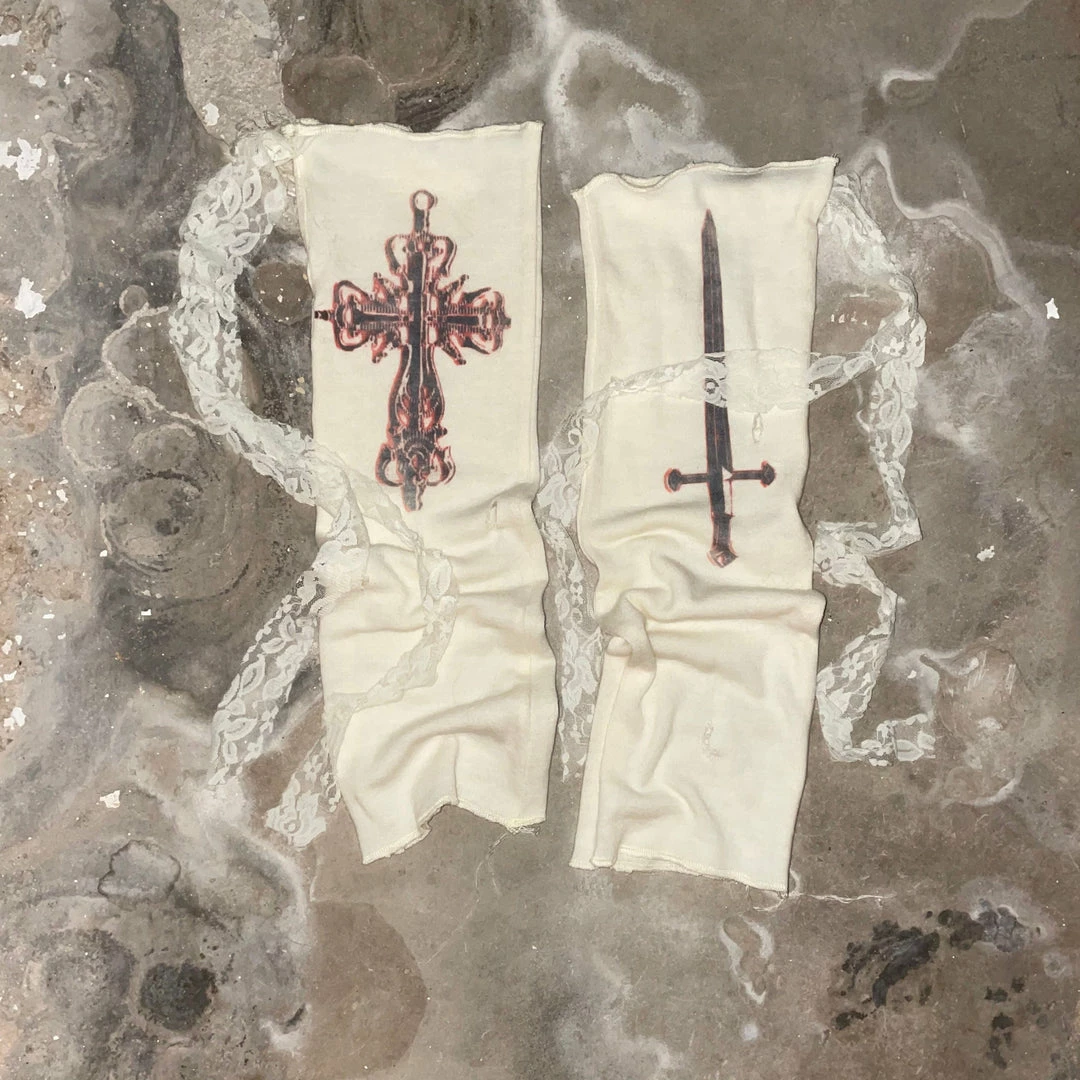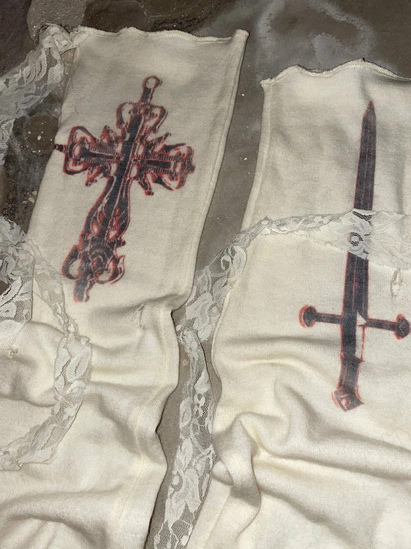Soft lightweight knit and faux angora jersey with cream lace ribbons for tie-up around the legs. Handmade prints.