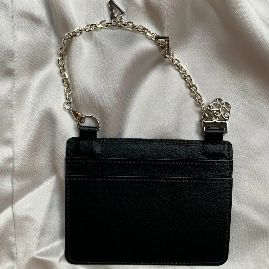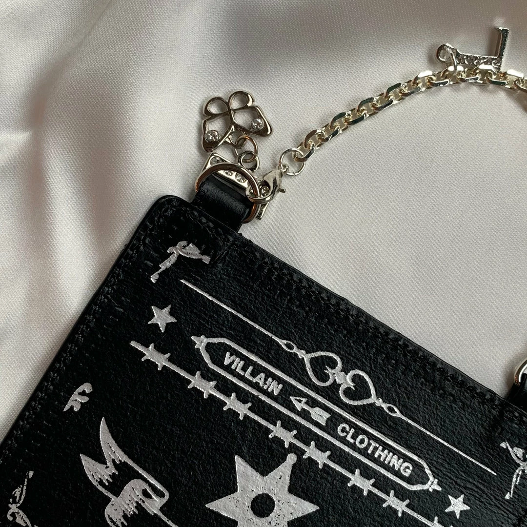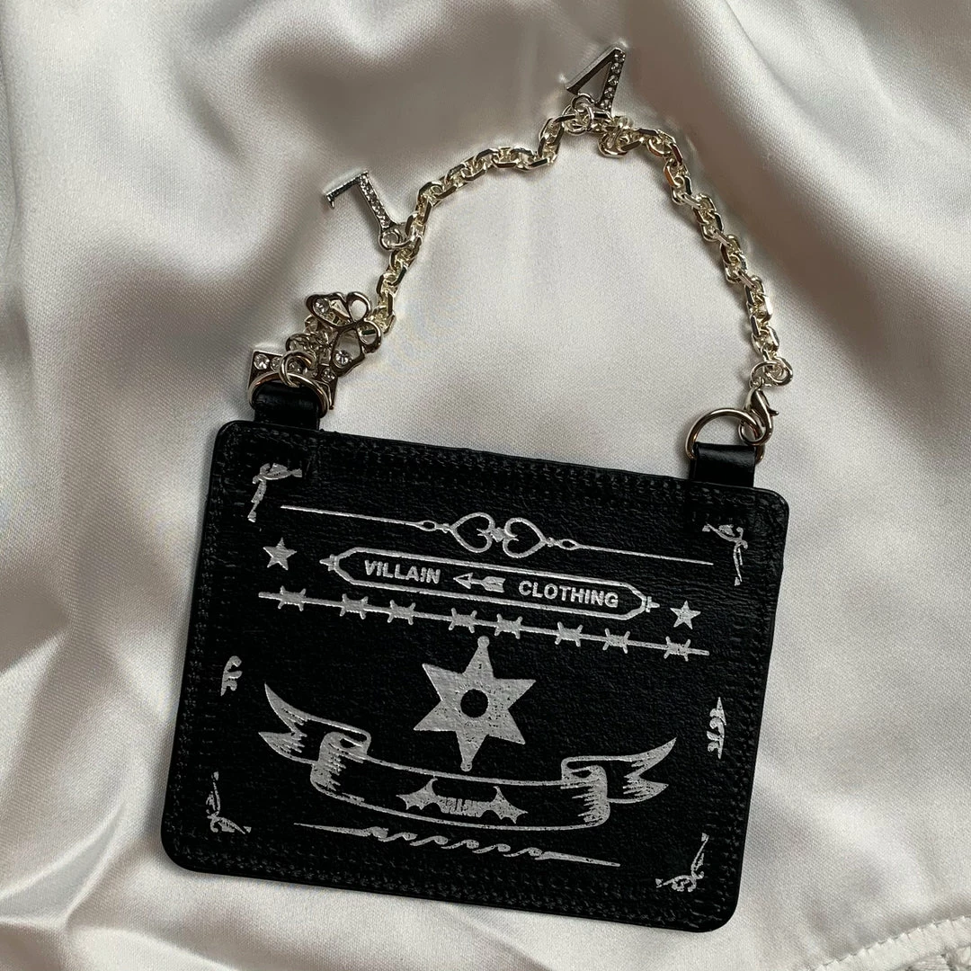 Card holder with sherif Wwwvillain details and chain made out of vegan leather.